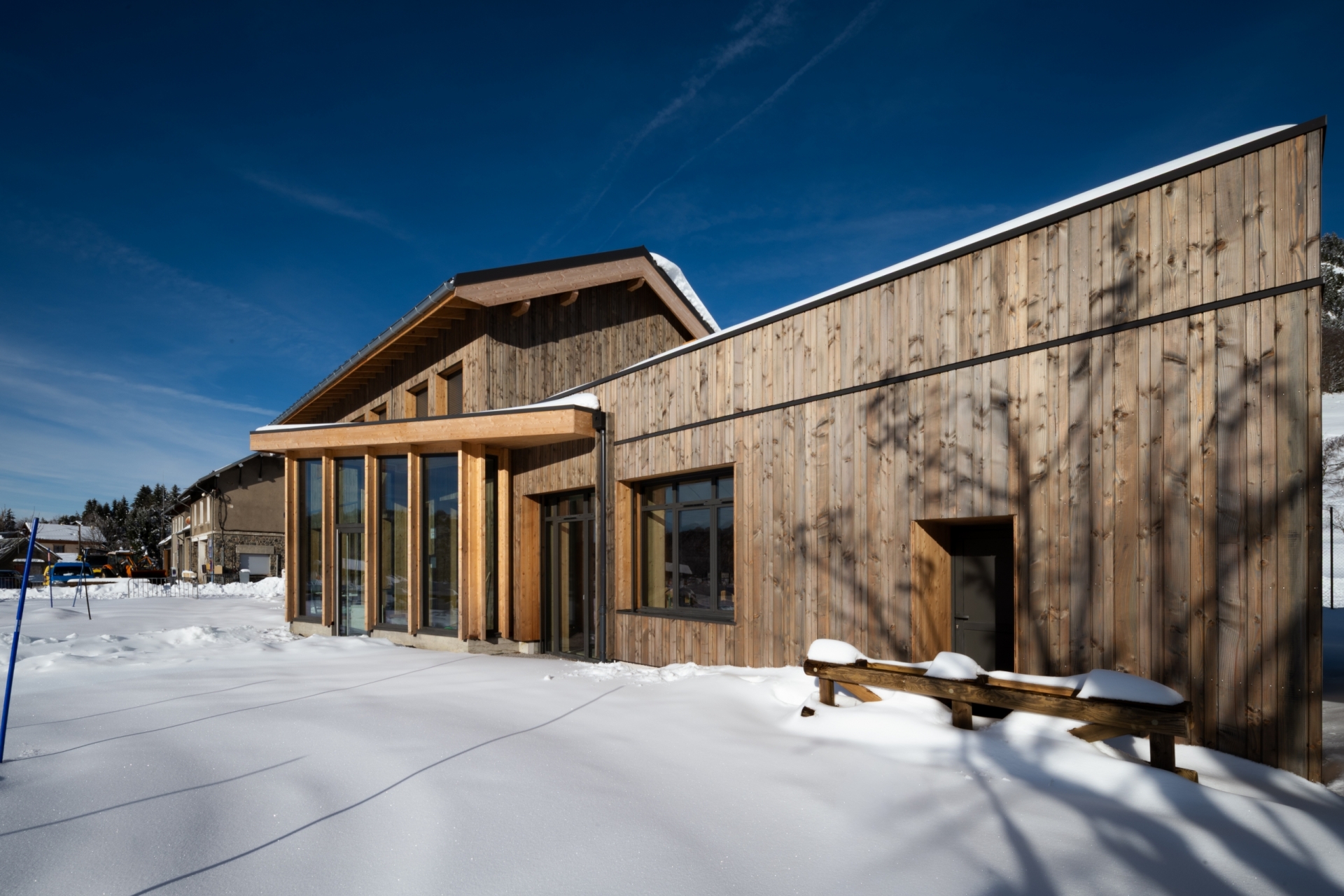 Plus que pour tout autre projet, le choix de la matière et des techniques constructives a été un préalable au démarrage du processus de conception, avec pour objectif une insertion paysagère exemplaire dans ce contexte de montagne : le bois et la paille requalifient le rapport du bâti à son environnement.